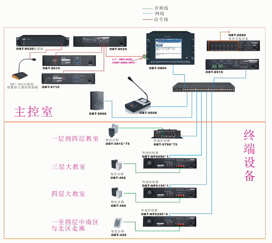 4、各分區設置:廣播區域(除教室外),每個區域配置IP網絡終端適配器(帶功率)、或IP網絡終端適配器與功率放大器的發配使用,根據不同區域選配不同的音箱進行擴聲。